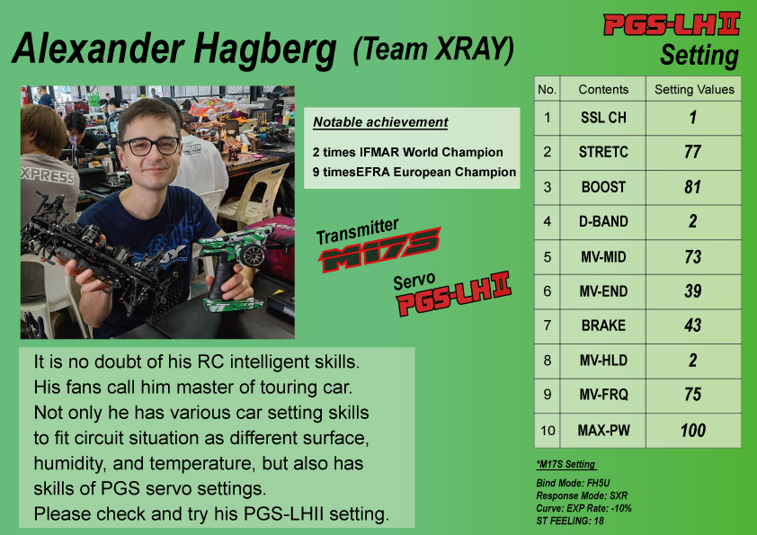 We upload 2 times IFMAR World Champion "Alexander Hagberg" PGS-LHII setting.